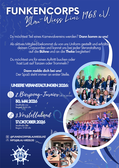 Die Große Linzer KG von 1934 e.V. ist die "Dachorganisation" der dazu gehörigen 8 Linzer Karnevalsvereine ohne deren Eigenständigkeit zu berühren. Mehr Informationen über die Große Linzer KG findest du auf ihrer Webseite.